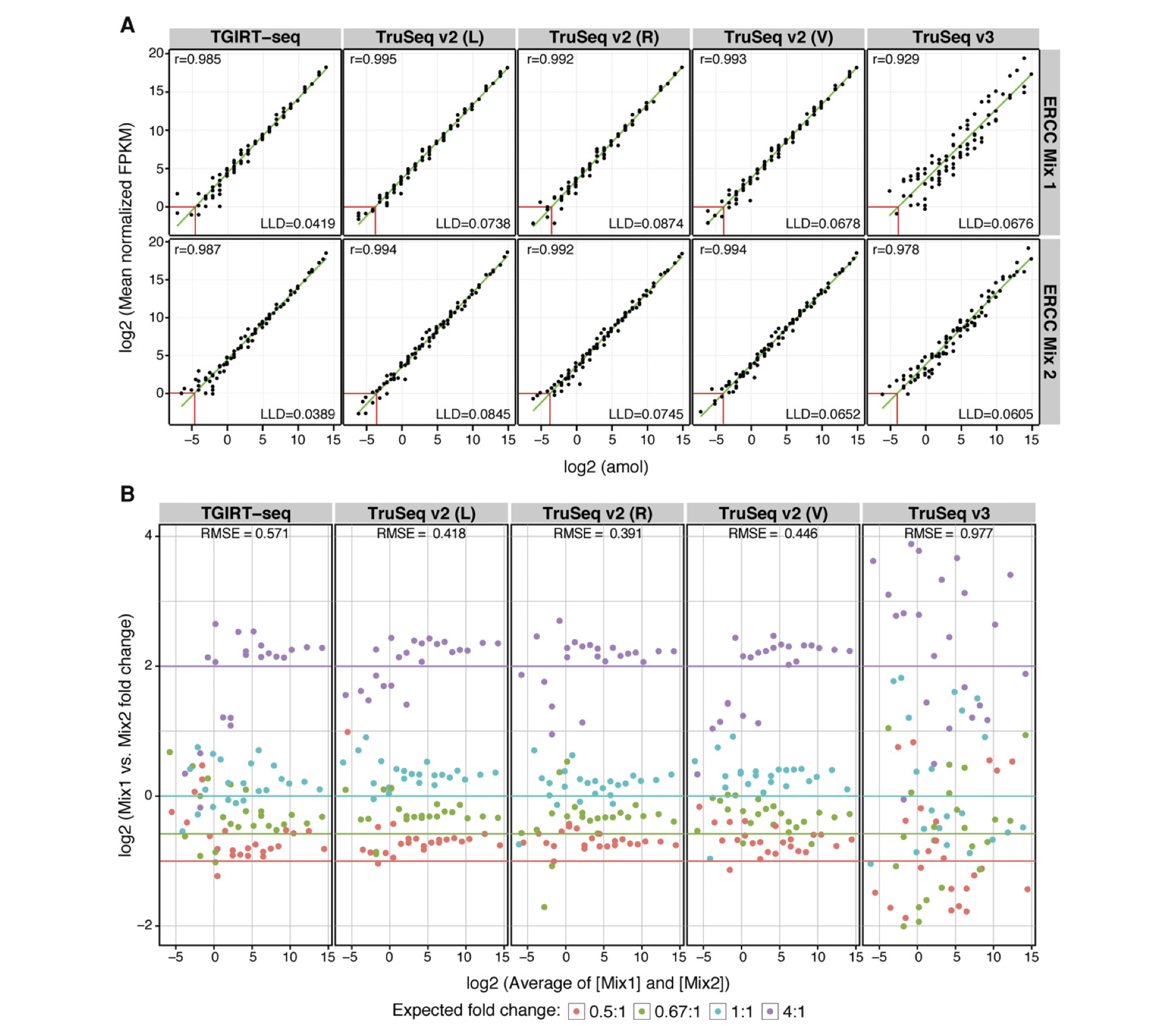 Second, TGIRT-seq showed recovered the spike-ins concentration (a) and recapitulate differential expressions accurately (b). In both cases, TGIRT-seq shows similar results compare to TruSeq v2 and has a better performance compare to TruSeq v3.